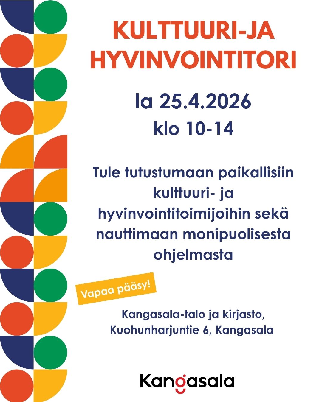 Kulttuuri- ja hyvinvointitori on tapahtuma, joka kokoaa yhteen paikallisia kulttuuri-, liikunta- ja hyvinvointialan toimijoita esittelemään palveluitaan ja toimintaansa. Tapahtuma tarjoaa monipuolista ohjelmaa kaikenikäisille, kuten työpajoja, esityksiä ja mahdollisuuksia tutustua harrastusmahdollisuuksiin. Torin tavoitteena on edistää yhteisöllisyyttä, hyvinvointia ja asukkaiden osallisuutta Kangasalan alueella.
